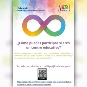 Por otro lado, dado que se han puesto en contacto varios centros educativos con nosotros pidiendo recursos para el día mundial del autismo, hemos creado una carpeta a la que podéis acceder con el enlace que aparece en el cartel o el código QR.