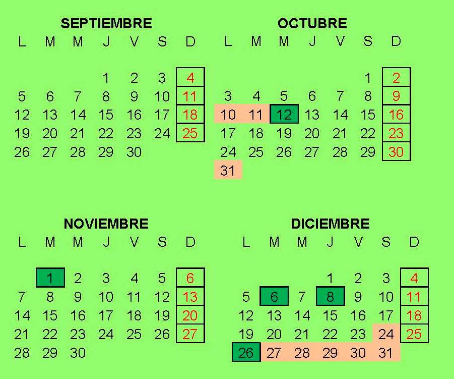Festividades de la Constitución y de la Inmaculada: martes 6 de diciembre y jueves 8 de diciembre.