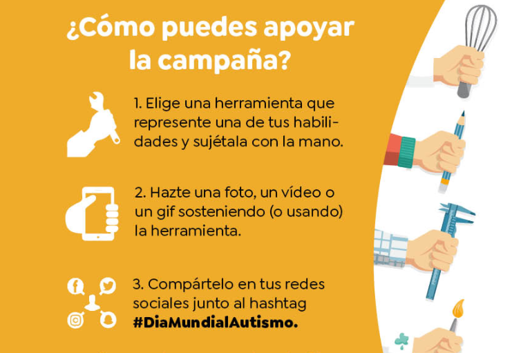 Te invitamos a hacer un gesto por el autismo y compartirlo es las redes sociales. Puedes sostener una herramienta que represente tu mejor habilidad profesional o utilizar los recortables que podrás descargarte de la página www.diamundialautismo.com. Además, en ella podrás consultar toda la información sobre la campaña de este año y descargarte todo el material para compartir y apoyarnos.