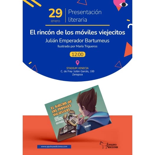 El miércoles 29 de enero a las 12:00h en el Salón Social del Stadium Venecia se llevará a cabo la presentación y Cuentacuentos del cuento El Rincón de los móviles viejecitos.