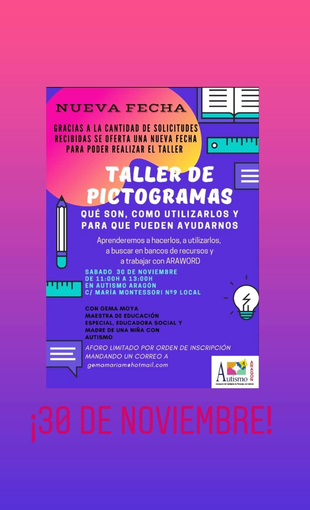 Debido a la cantidad de inscripciones para el taller de pictogramas de este sábado, se propone nueva fecha para realizar un segundo taller. Será el sábado 30 de noviembre, ¡no olvides inscribirte enviando un email a gemamariam@hotmail.com!