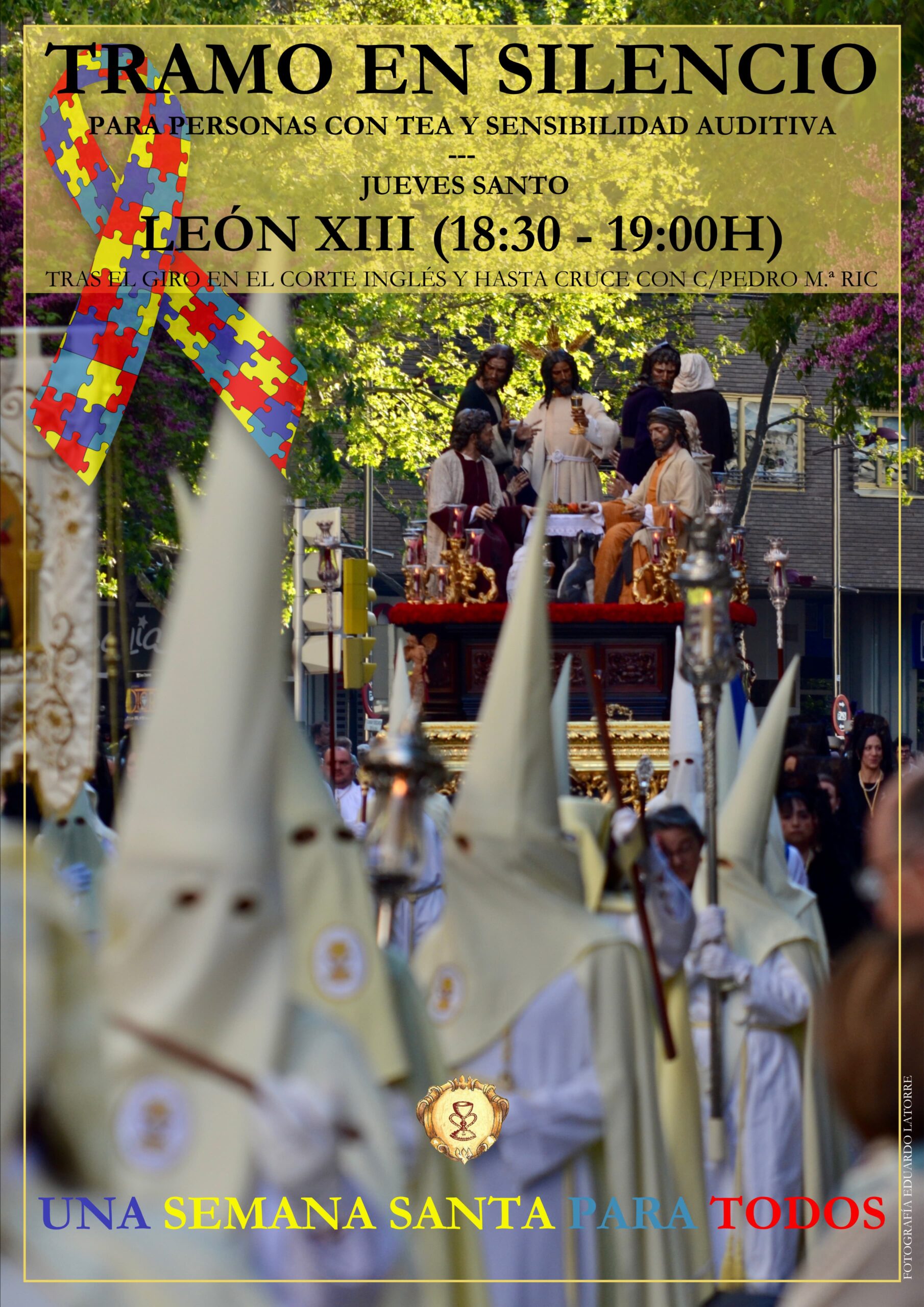 Durante el próximo Jueves Santo, para facilitar que personas con trastorno del espectro autista (TEA) o con sensibilidad auditiva puedan disfrutar de su Cofradía en la calle, habrá un «TRAMO EN SILENCIO». Dicho tramo se ubicará en el recorrido de ida; concretamente en la calle León XIII, entre el inicio de la misma (tras el giro en El Corte Inglés), y hasta el cruce con la calle Pedro María Ric. La franja horaria de llegada y paso se calcula que será entre las 18:30 y 19 horas aproximadamente.
